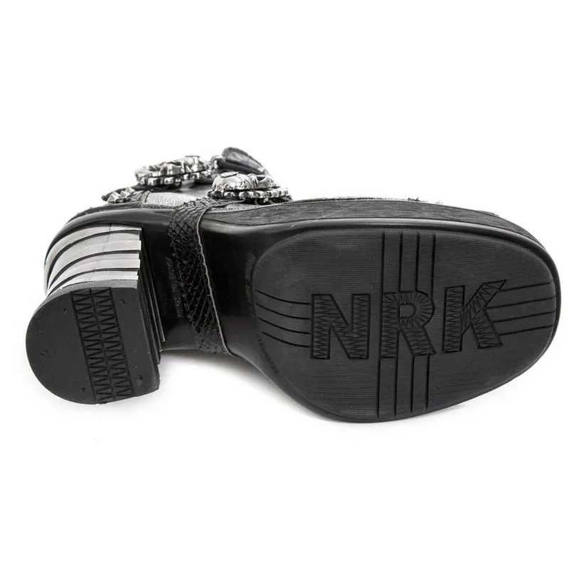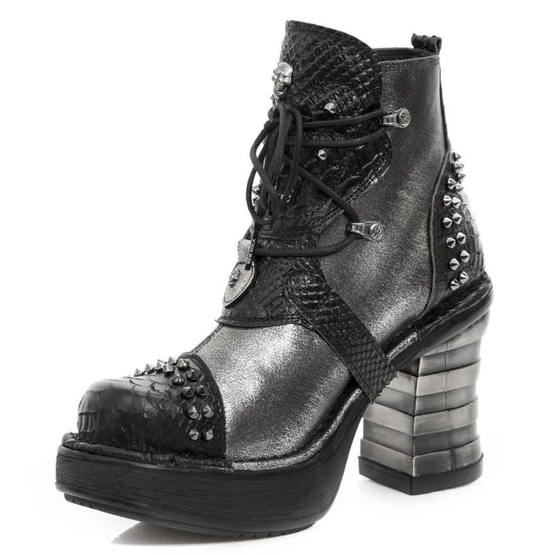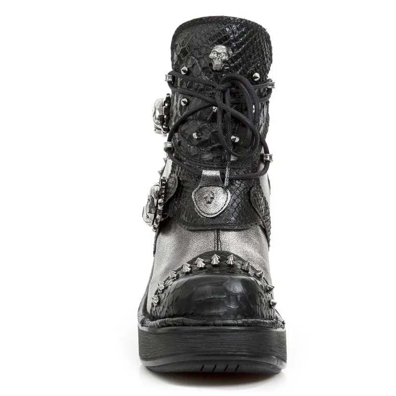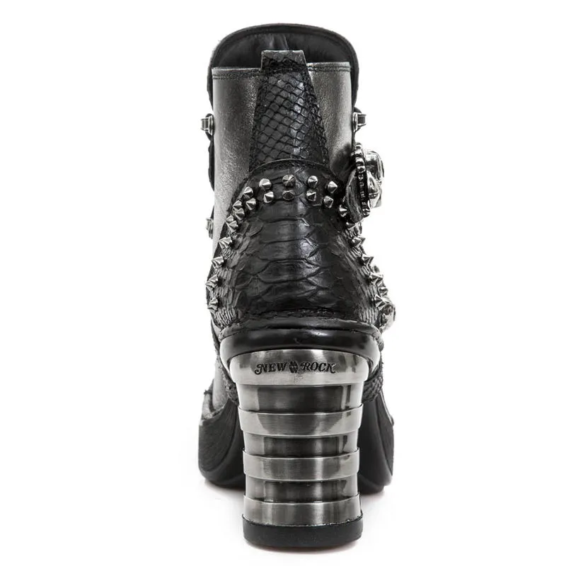 Superbes bottines New Rock à talons et cuir bi-matière. Un cuir lisse gris métallisé/chrome associé à un cuir noir brillant à effet peau de serpent. Le tout est en plus agrémenté de clous et de crânes en métal qui font office de boucles. On retrouve cette touche de métal dans le talon, typique de la marque New Rock. Avec ces bottines, c’est un look hors normes assuré !