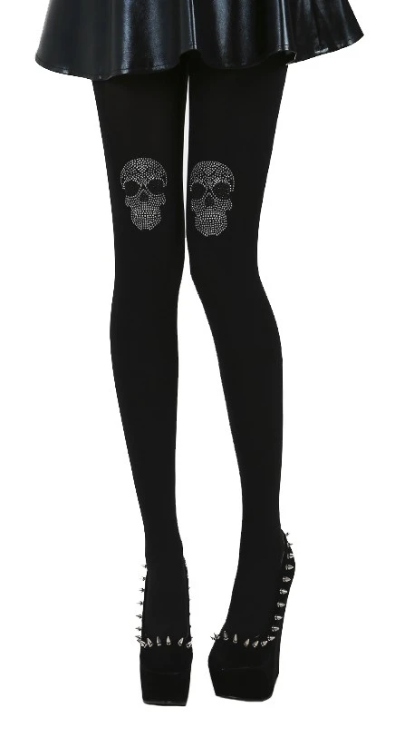 Look 100% goth avec ces collants noirs opaques décorés d’une grosse tête de mort en strass sur chaque jambe