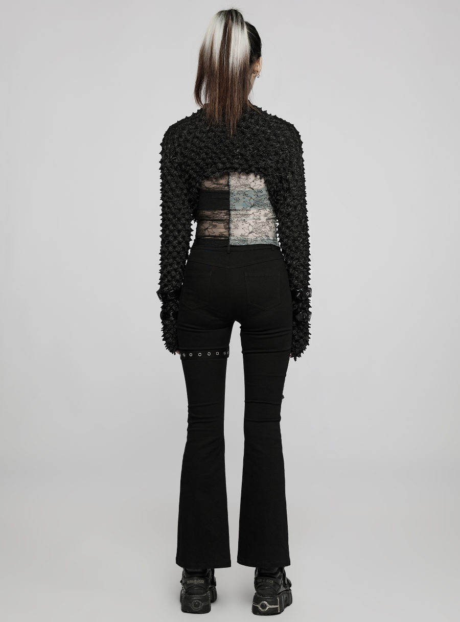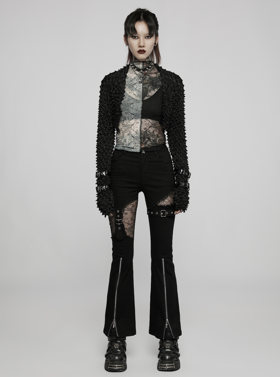 Grandes fermetures éclair au bas du pantalon laissant apparaître une fine dentelle si vous les ouvrez