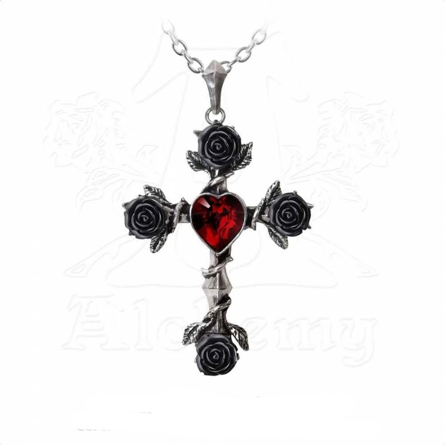 Très belle croix gothique ornée de roses noires aux extrémités et d’un coeur rouge en cristal Swarovski en son centre