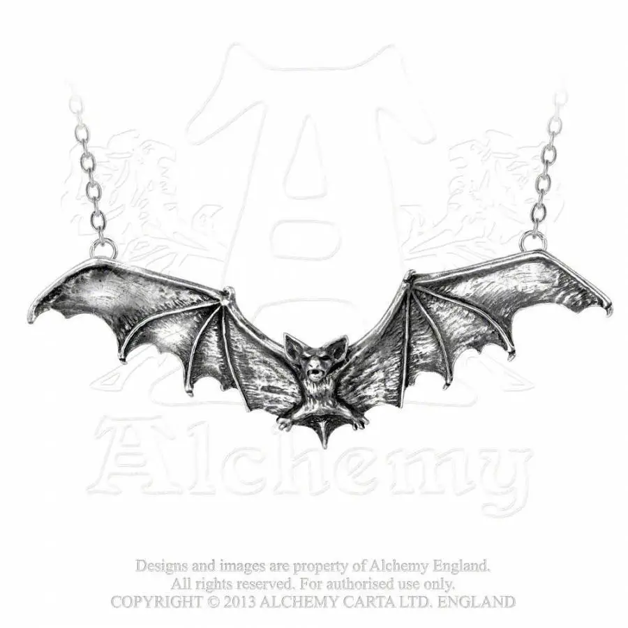 Grand et imposant pendentif gothique de 13 cm en forme de chauve-souris-chauve vampire, taillé dans un étain vieilli façon antique, il est dans le pur esprit dark/goth.