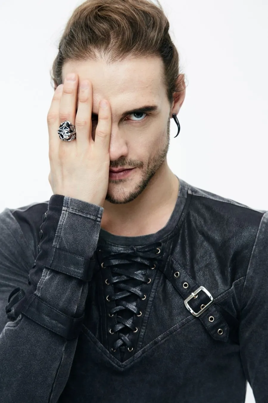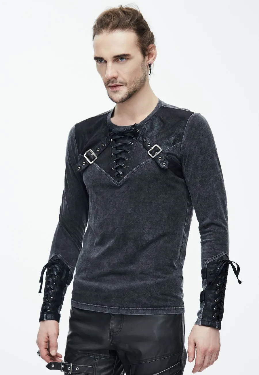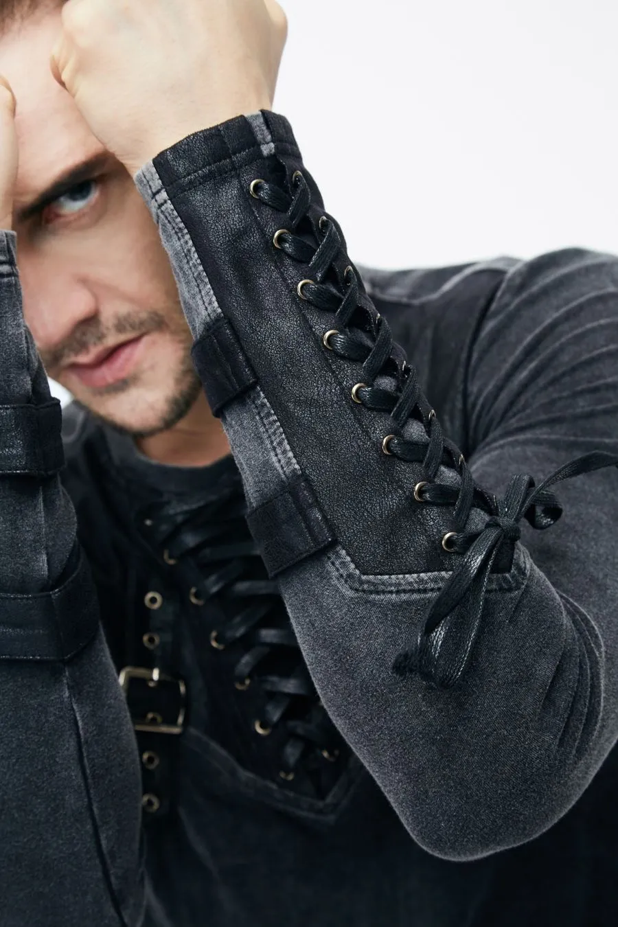 Pull gothique homme col rond en tissu léger gris anthracite, il est agrémenté de pièces de simili cuir noir et de laçages aux manches et au niveau de la poitrine