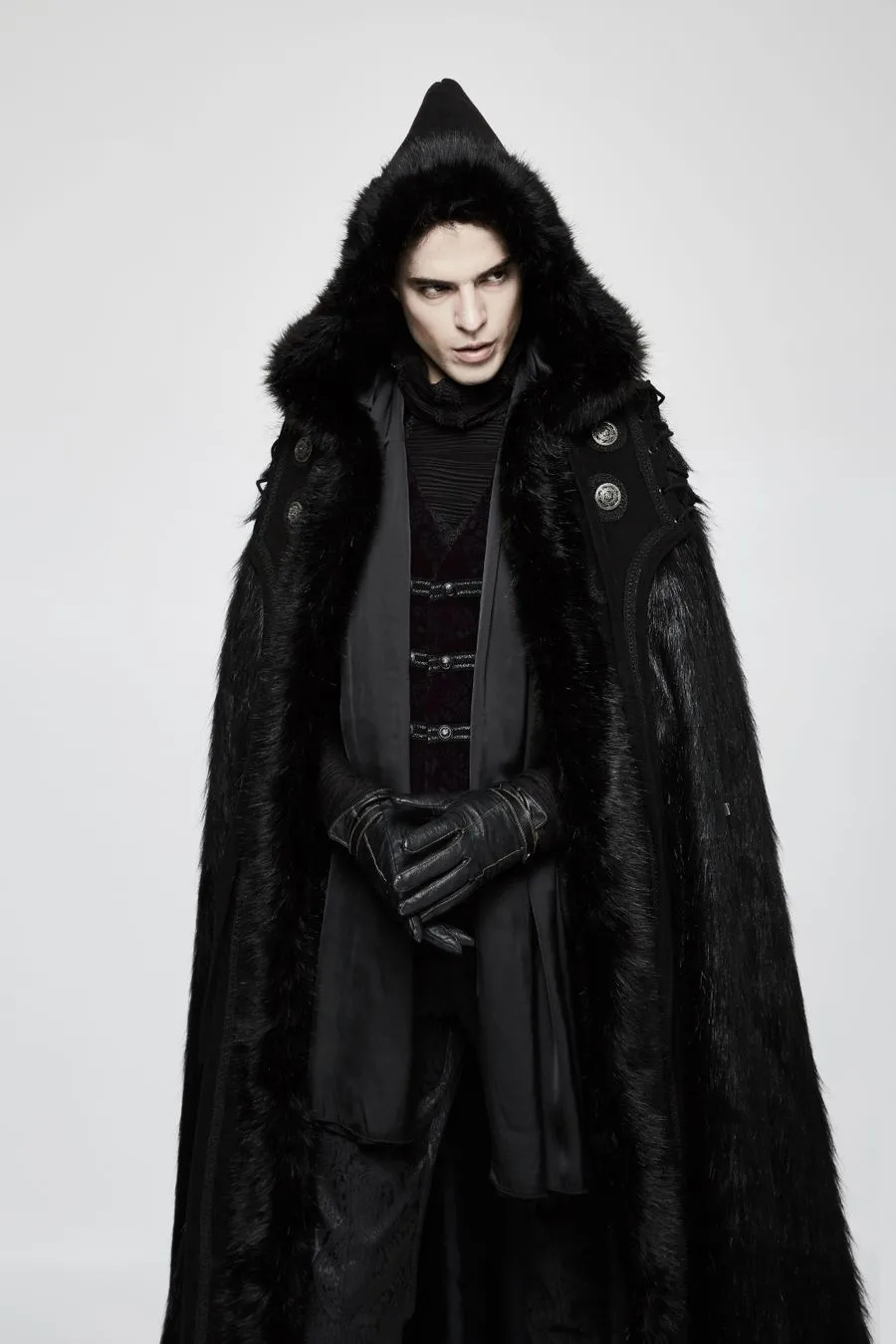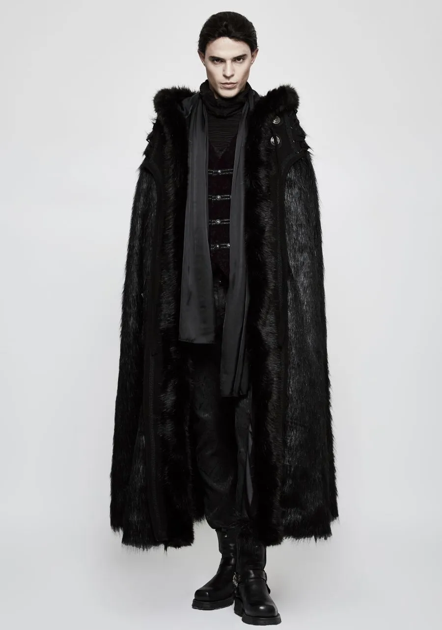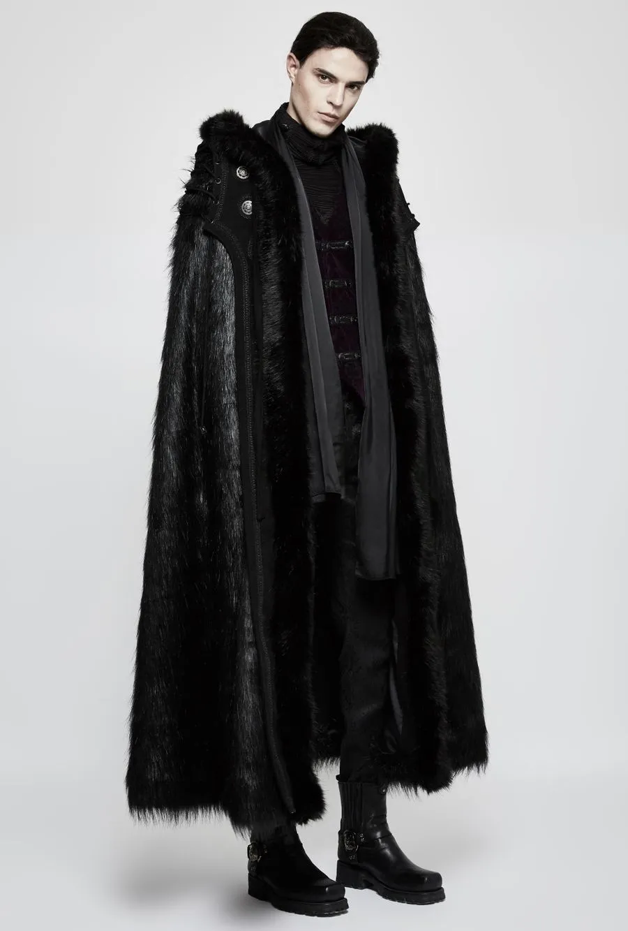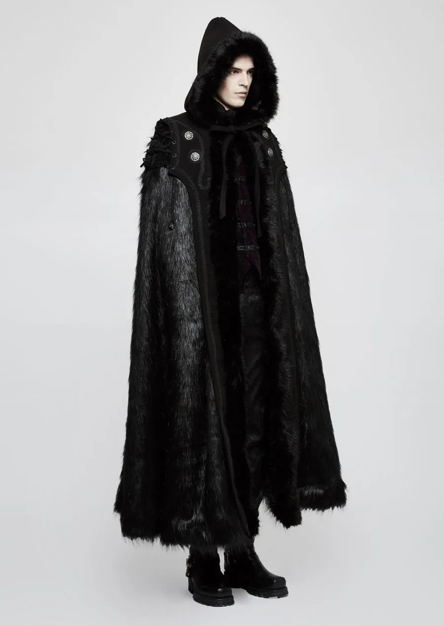 Elle est composée d’une partie en laine décorée de gros boutons en étain, de belles broderies et de cordages sur les épaules, le reste de la cape est entièrement recouvert de fausse fourrure d’un noir corbeau très profond
