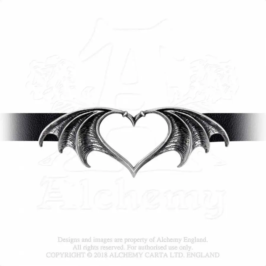 Etroit tour de cou en simili cuir noir orné d’un superbe coeur aux ailes de chauve-souris en étain vieilli, plus goth que ça tu meurs !