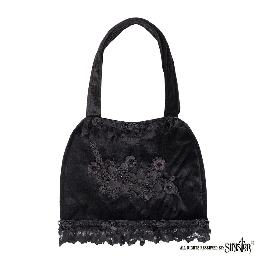 Le devant de ce sac de soirée noir est orné d’une délicate application de fleurs et de feuilles en brocart noir ornée de perles, de bouton de rose en satin et de dentelle noire.