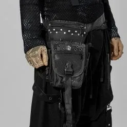 La sacoche est richement décorée de gros rivets, de clous pointus, d’oeillets et d’une tête de mort métallique