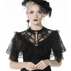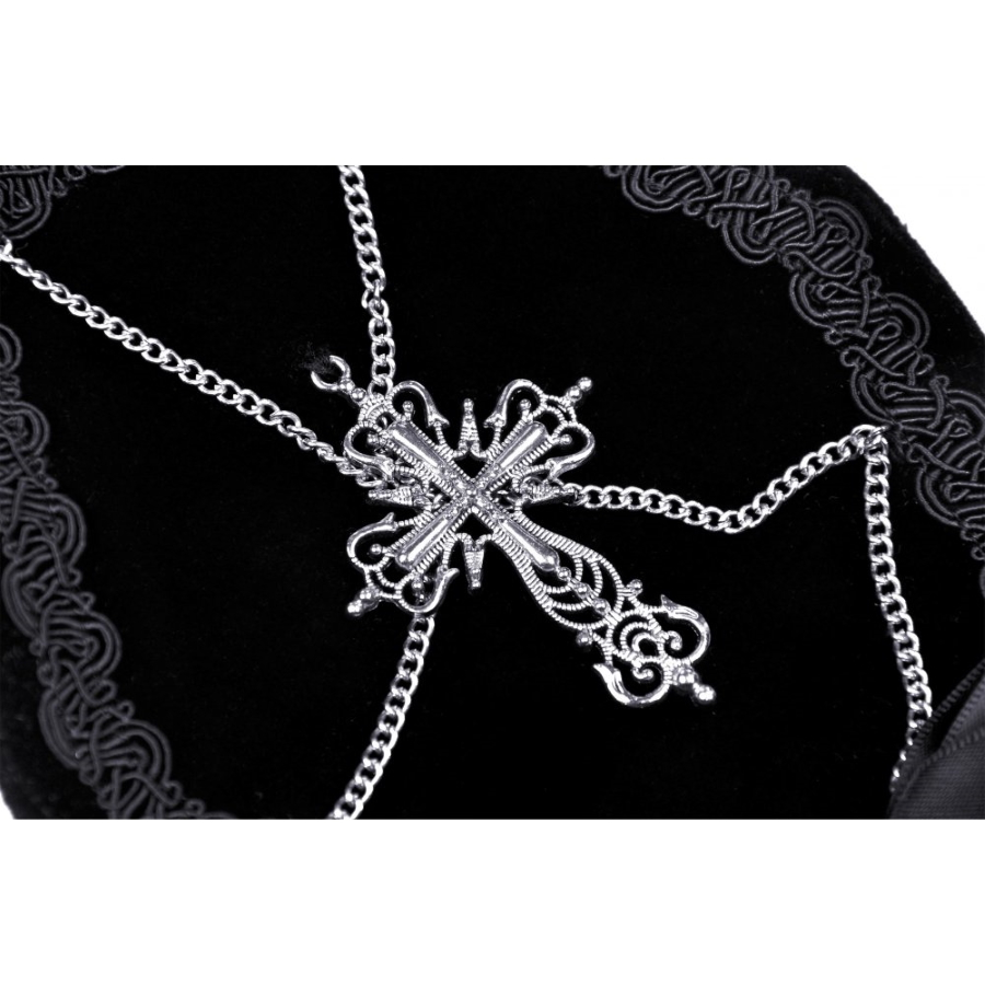 Elle est ornée d’une croix gothique en métal, de petites chaînettes ety d’un noeud de satin