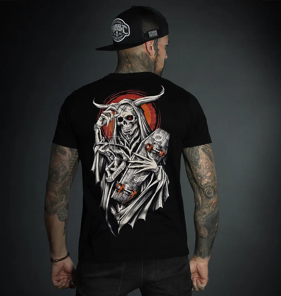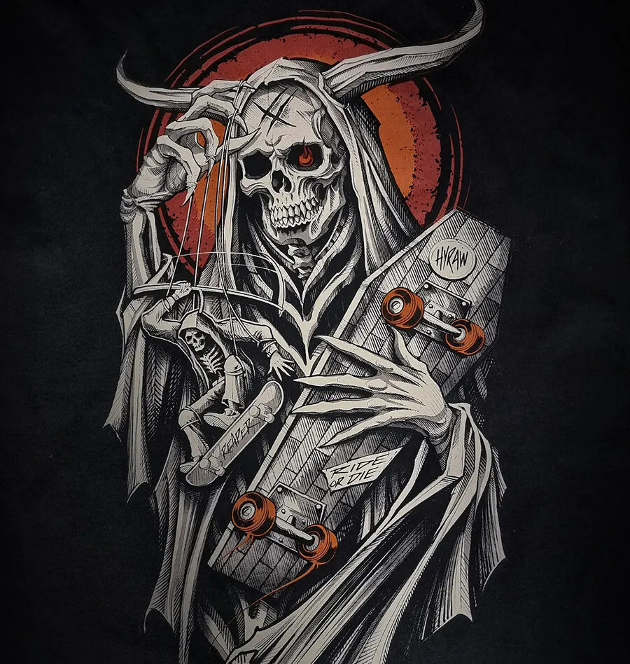 L’imprimé représente un squelette aux grandes cornes avec un skateboard en forme de cercueil