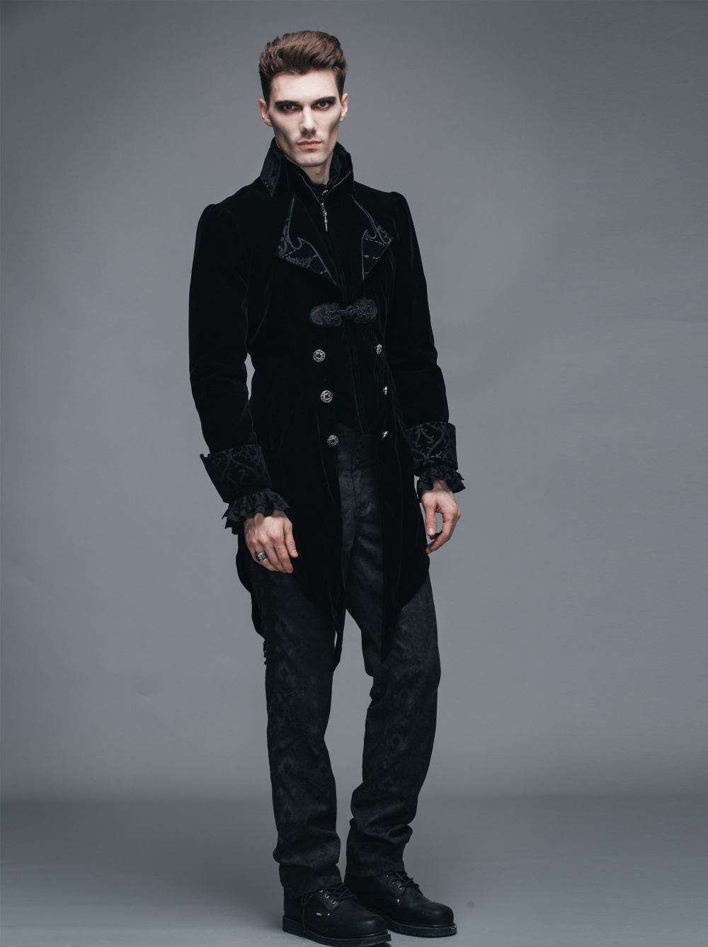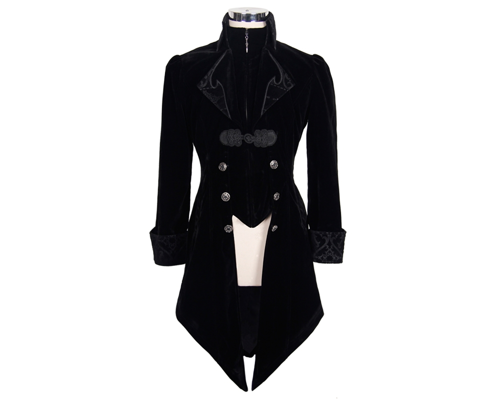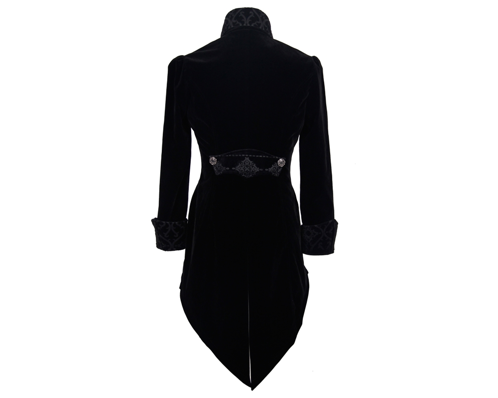 La coupe en queue de pie lui donne un style de grande classe dans le pur esprit vampirique, elle est agrémentée d’une grosse broderie et de beaux boutons, les revers de manches et de col sont décorés de motifs baroque.