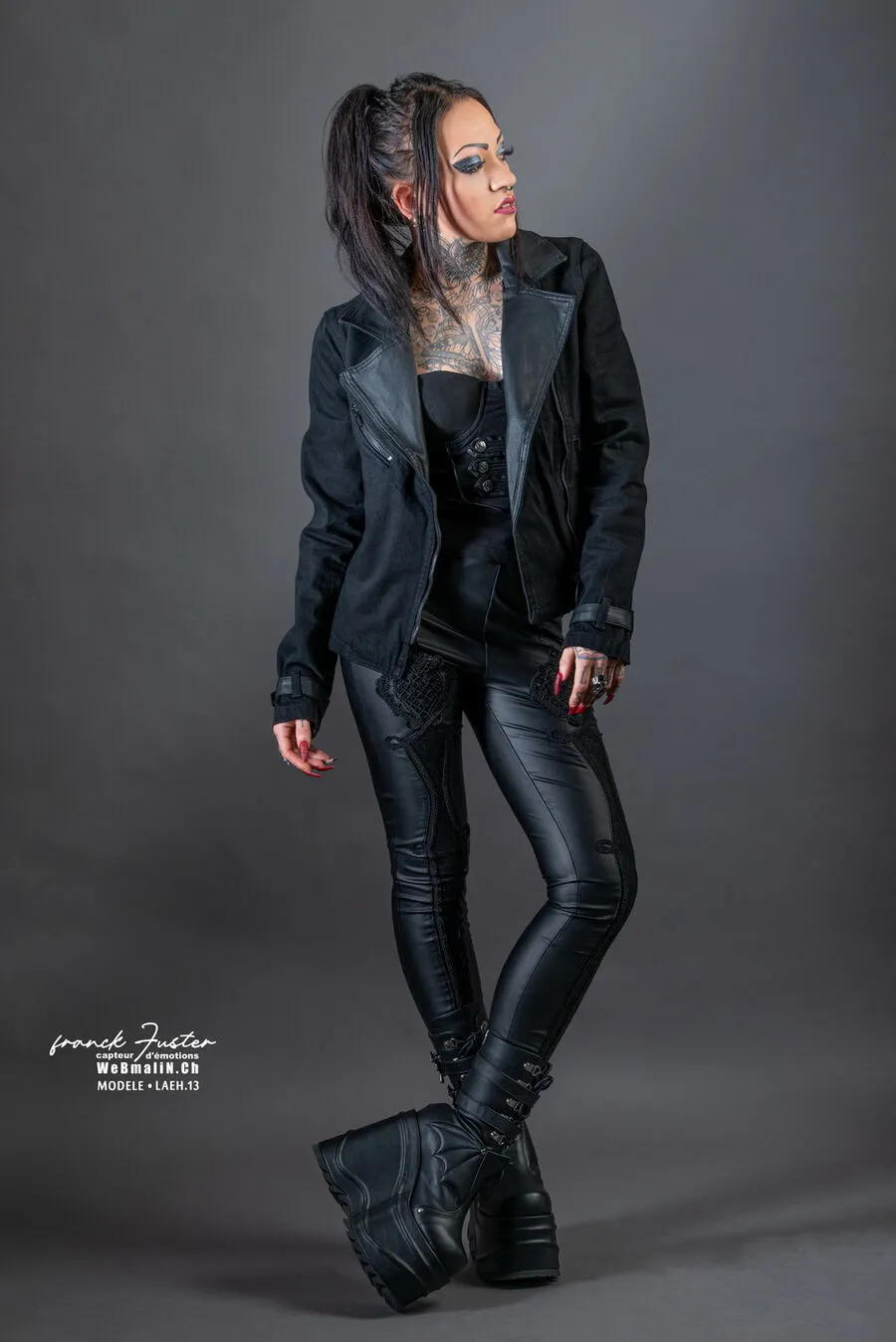 Belle veste biker femme en toile de jean noire extensible par Killstar