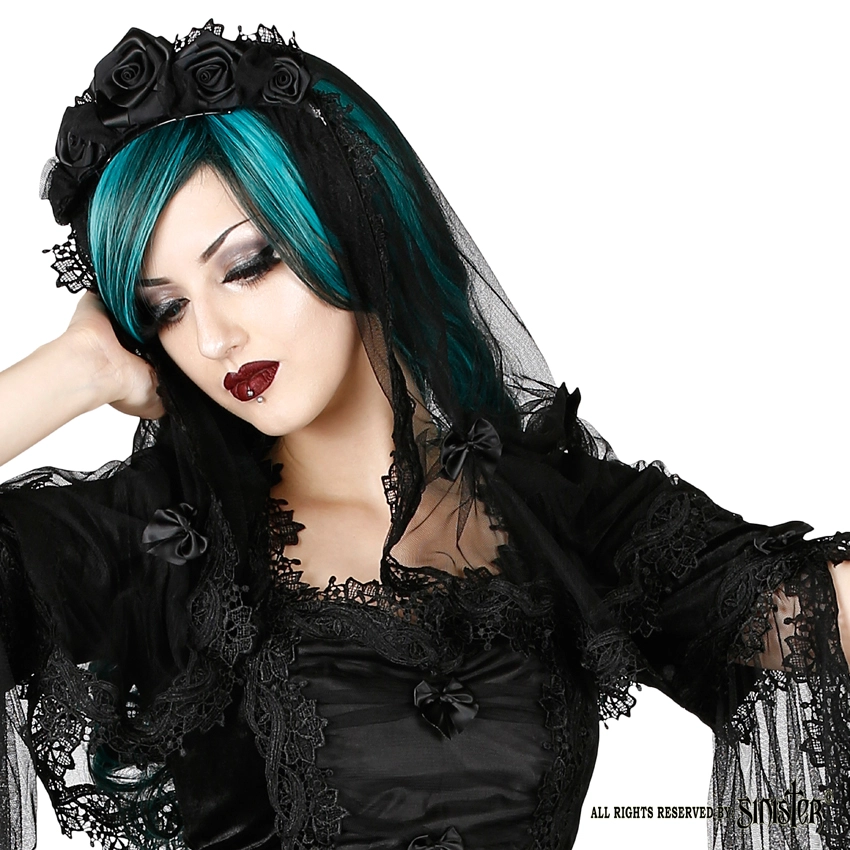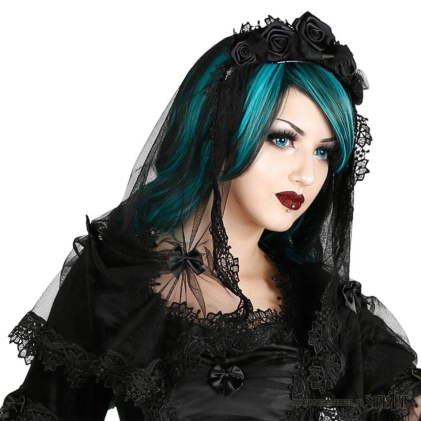 Voile de deuil en maille souple noire froncée de noeuds en satin noir et de garnitures en dentelle vénitienne. Le voile est attaché à un peigne noir décoré de roses de satin noir.